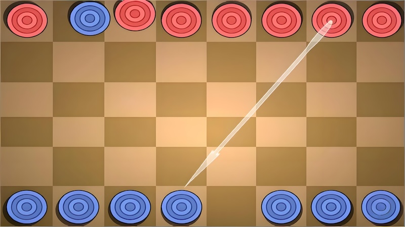 - ✓Players click and drag their pieces, adjusting direction and power before releasing to launch them using physics-based mechanics, knocking opponent's checkers off the board.