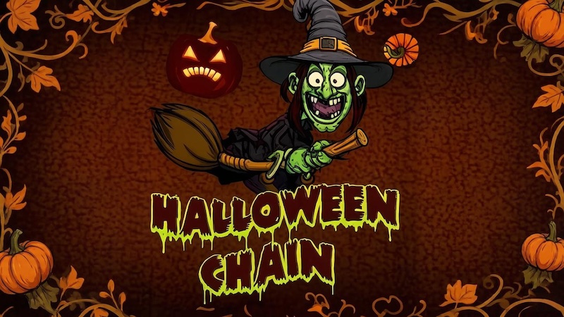 Halloween Chain is a Halloween-themed puzzle game in the style of Zuma. Players take on the role of a witch, shooting colored pumpkin balls at a rolling chain on the track—matching three or more of the same color eliminates them and scores points. The goal is to stop the balls from reaching the skull at the end of the track and clear all balls to advance, with a total of 13 levels.